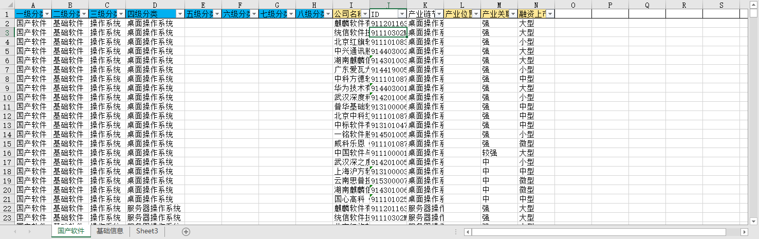 一级分类 二级分类 三级分类 四级分类 五级分类 六级分类 七级分类 八级分类 公司名称 ID 产业链节点 产业位置 产业关联性 融资上市