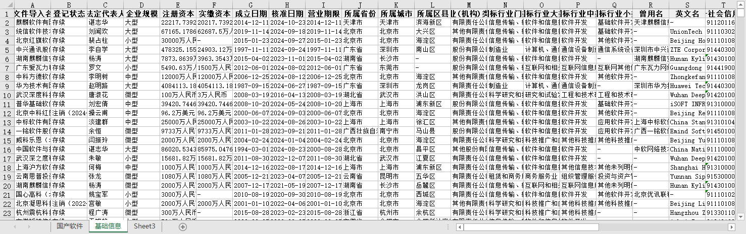 原文件导入名称 登记状态 法定代表人 企业规模 注册资本 实缴资本 成立日期 核准日期 营业期限 所属省份 所属城市 所属区县 企业(机构)类型 国标行业门类 国标行业大类 国标行业中类 国标行业小类 曾用名 英文名 统一社会信用代码 纳税人识别号 注册号 组织机构代码 参保人数 参保人数所属年报 电话 更多电话 企业地址 通信地址 官网 邮箱 更多邮箱 经营范围 登记机关 纳税人资质 企业简介 最新年报年份 等等