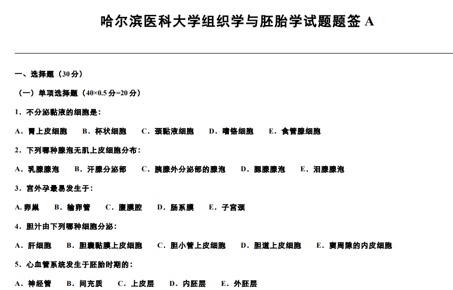 03中文哈医大哈尔滨医科大学组织学与胚胎学及答案一套(即一年的).pdf