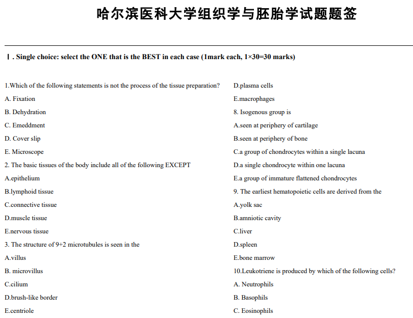 01中文哈医大哈尔滨医科大学组织学与胚胎学及答案一套(即一年的)