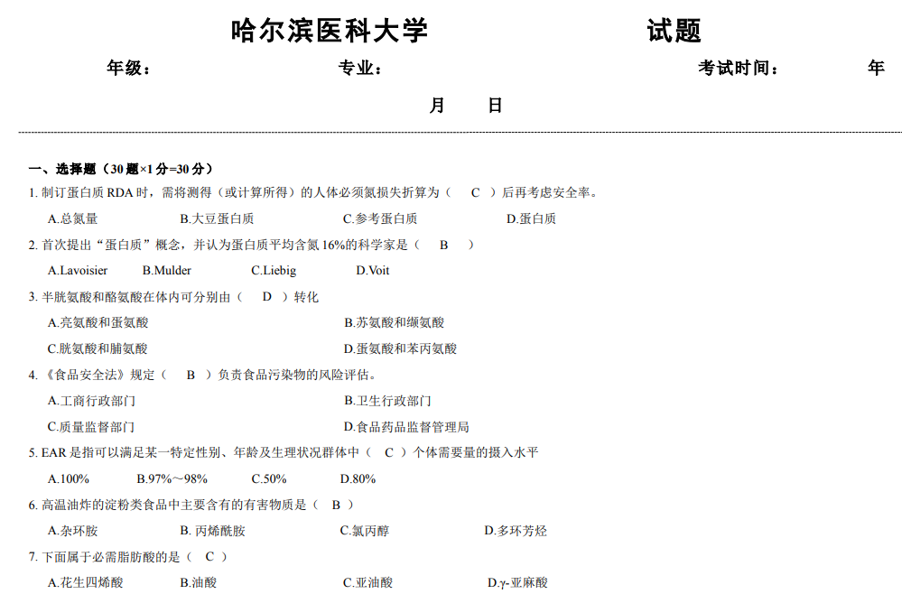 01哈医大哈尔滨医科大学营养与食品卫生学及答案一套(即一年的)