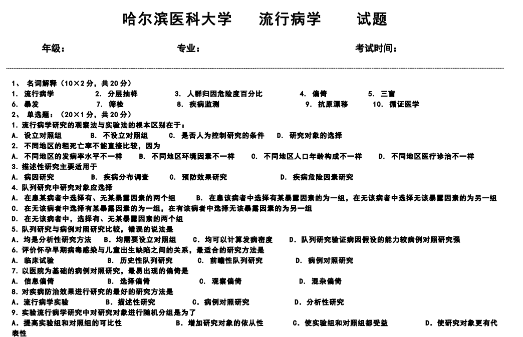 02哈医大哈尔滨医科大学流行病学(无答案)一套(即一年的)