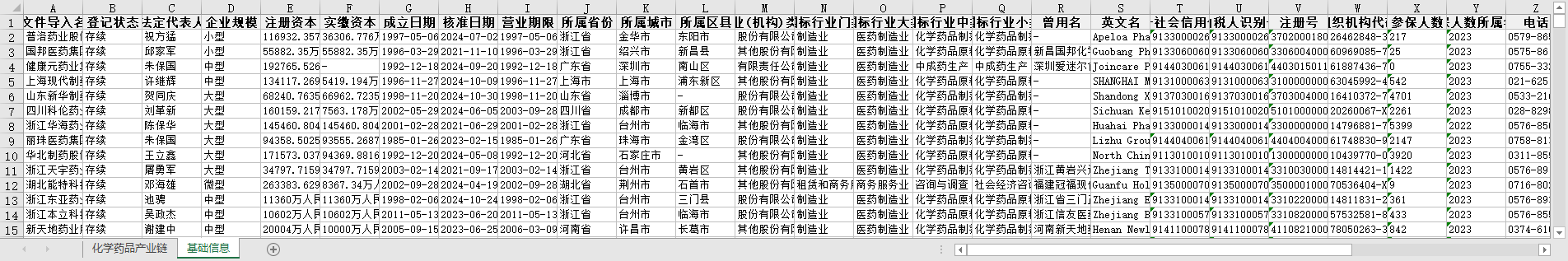 化学药品产业链全国上中下游企业信息1949-2024节点关联性参保人数联系电话法定代表人所属行业省份城市区县等