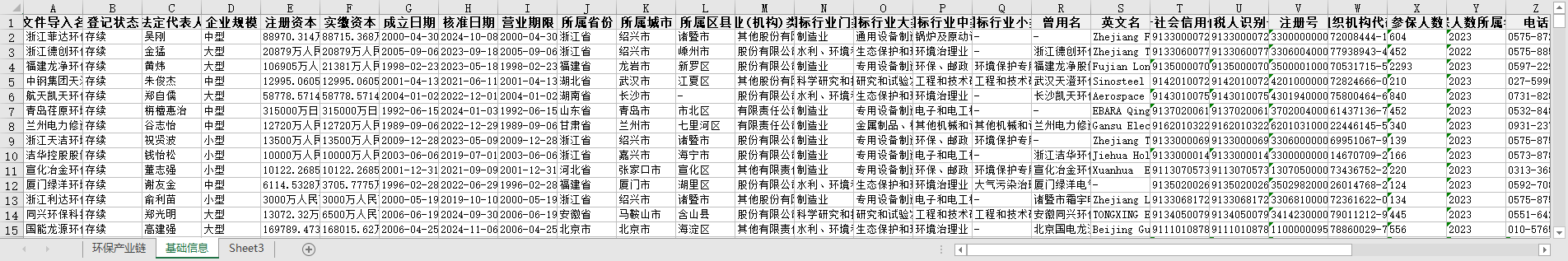 原文件导入名称 登记状态 法定代表人 企业规模 注册资本 实缴资本 成立日期 核准日期 营业期限 所属省份 所属城市 所属区县 企业(机构)类型 国标行业门类 国标行业大类 国标行业中类 国标行业小类 曾用名 英文名 统一社会信用代码 纳税人识别号 注册号 组织机构代码 参保人数 参保人数所属年报 电话 更多电话 企业地址 通信地址 官网 邮箱 更多邮箱 经营范围 登记机关 纳税人资质 企业简介 最新年报年份 等等