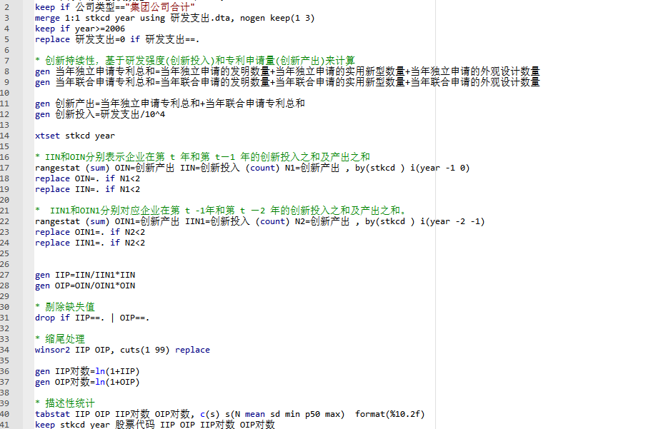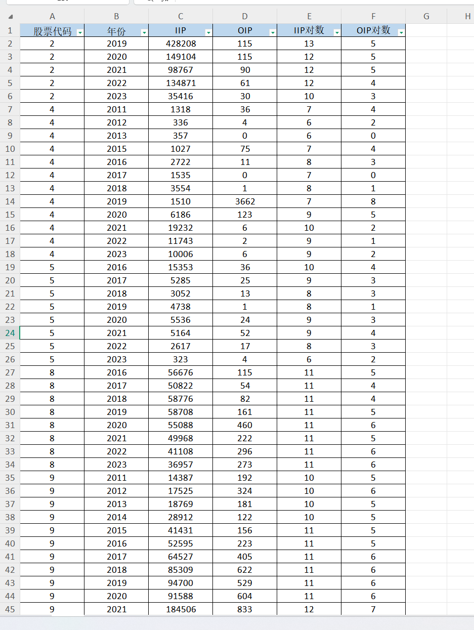 股票代码、年份、IIP、OIP、IIP对数、OIP对数