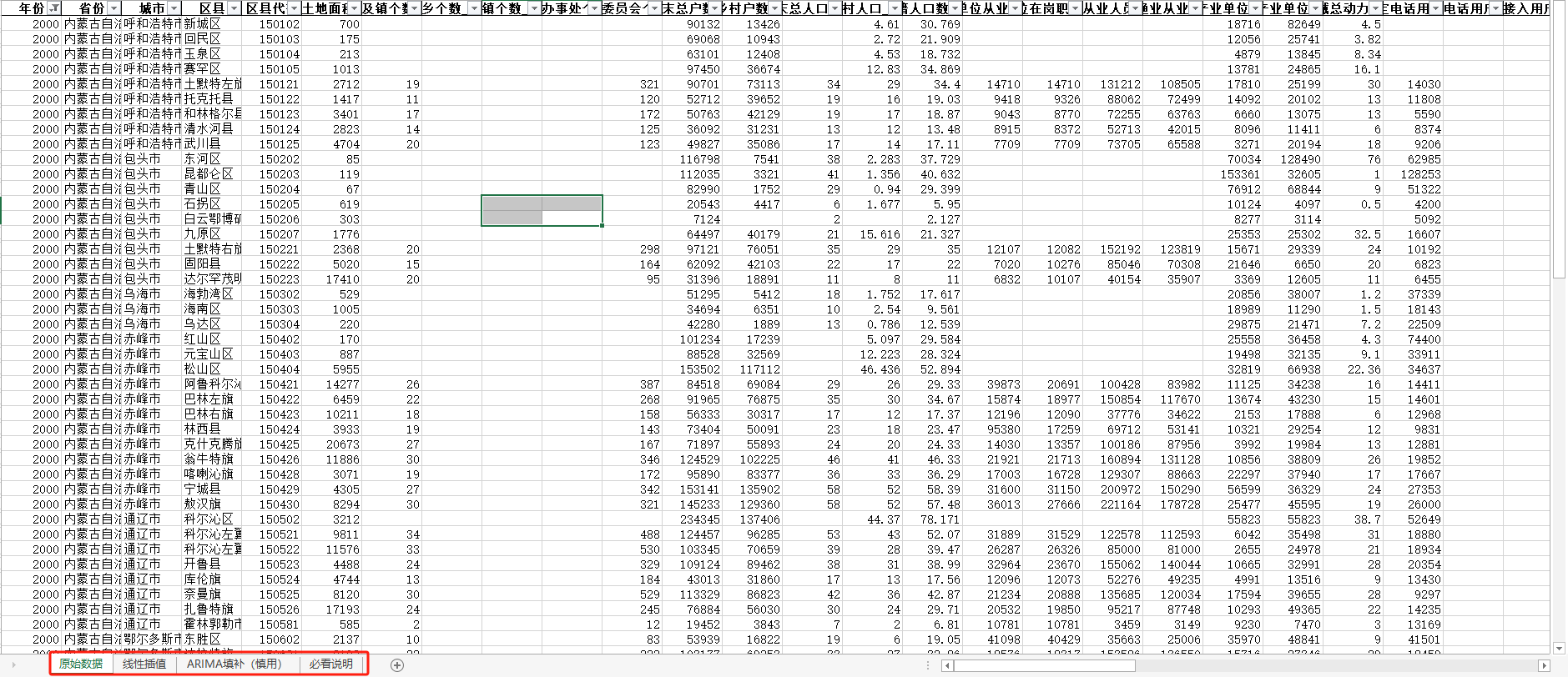 中国区县面板统计数据库(包含三个页签:原始数据、线性插值、ARIMA填补三个页签),收录了全国2700多个县域单位的基本情况、综合经济、农业、工业、教育、卫生、社会保障等方面的资料。