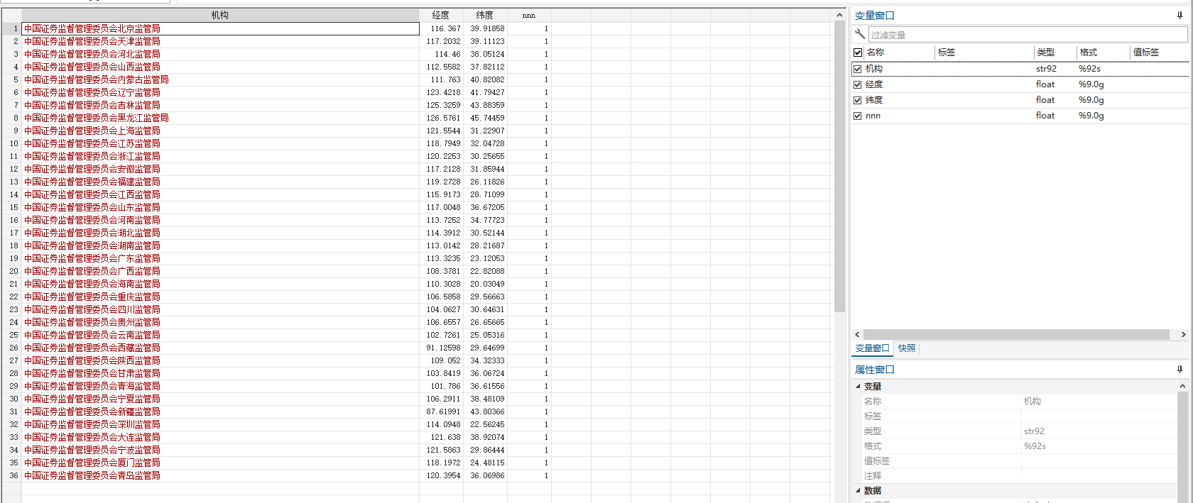 运用百度地图和谷歌地图等工具,输入证监会分支机构的办公地和上市公司注册地,手工收集上市公司注册地和各监管局所对应的经纬度坐标。