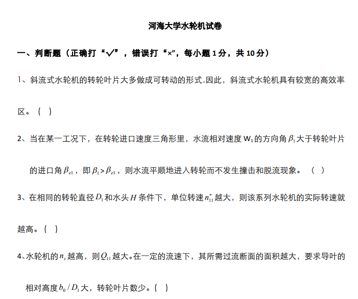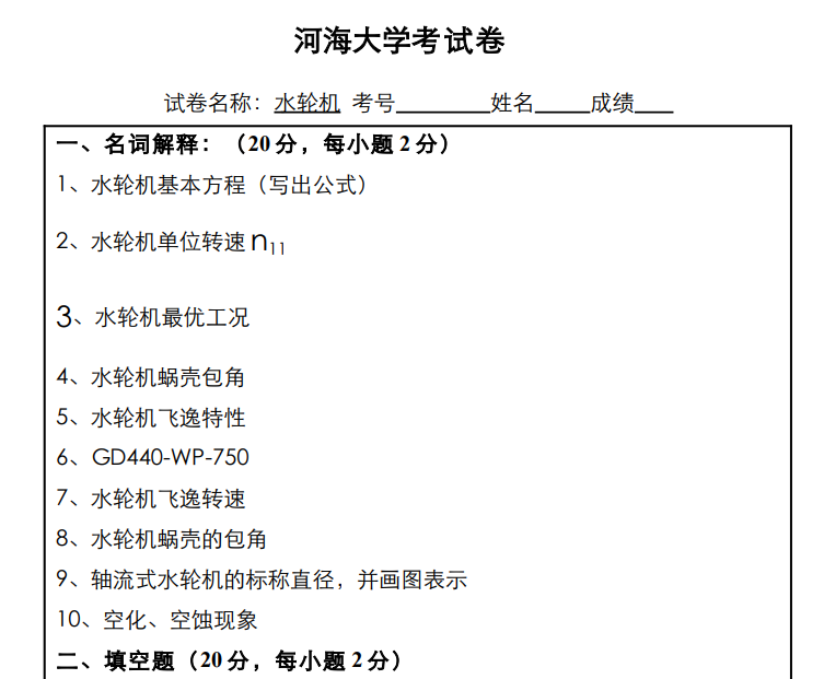 河海大学水轮机试卷试题