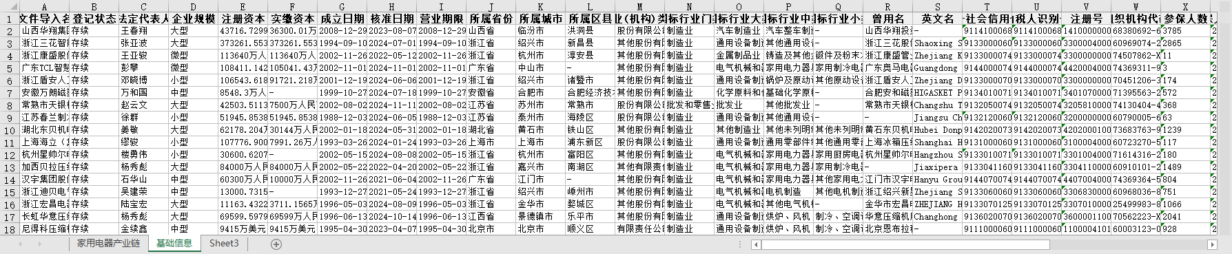 原文件导入名称 登记状态 法定代表人 企业规模 注册资本 实缴资本 成立日期 核准日期 营业期限 所属省份 所属城市 所属区县 企业(机构)类型 国标行业门类 国标行业大类 国标行业中类 国标行业小类 曾用名 英文名 统一社会信用代码 纳税人识别号 注册号 组织机构代码 参保人数 参保人数所属年报 电话 更多电话 企业地址 通信地址 官网 邮箱 更多邮箱 经营范围 登记机关 纳税人资质 企业简介 最新年报年份 等等