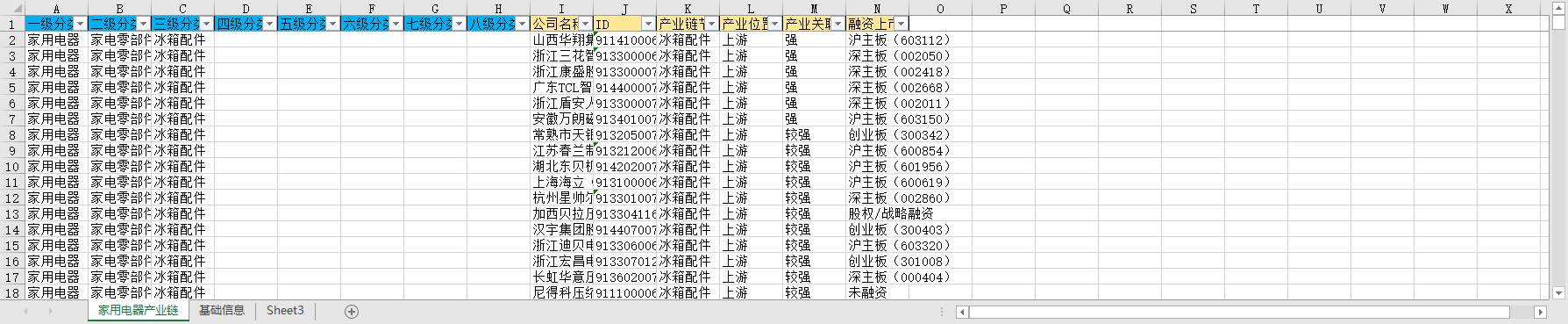 一级分类 二级分类 三级分类 四级分类 五级分类 六级分类 七级分类 八级分类 公司名称 ID 产业链节点 产业位置 产业关联性 融资上市