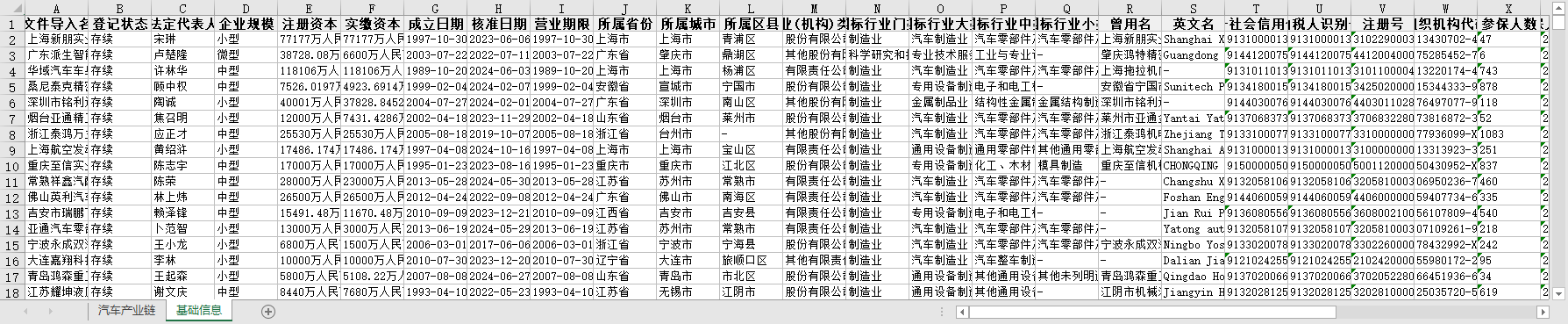 流通服务制造等领域汽车产业链全国上中下游企业信息1949-2024节点关联性参保人数联系电话法定代表人所属行业省份城市区县等