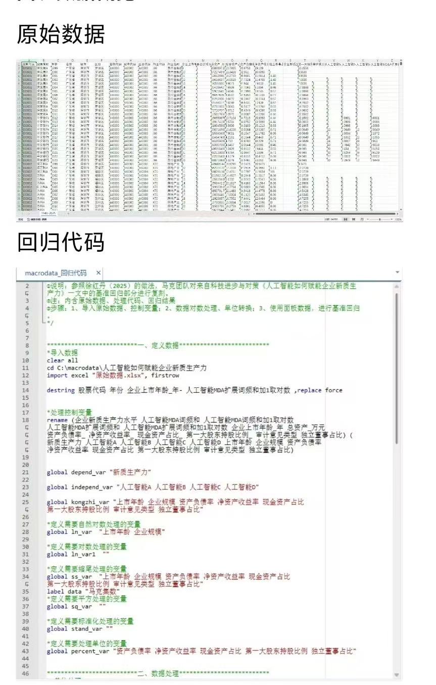 参照徐红丹(2025)的做法,马克团队对来自科技进步与对策《人工智能如何赋能企业新质生产力》一文中的基准回归部分进行复刻,包括原始数据、dofile、基准回归结果
