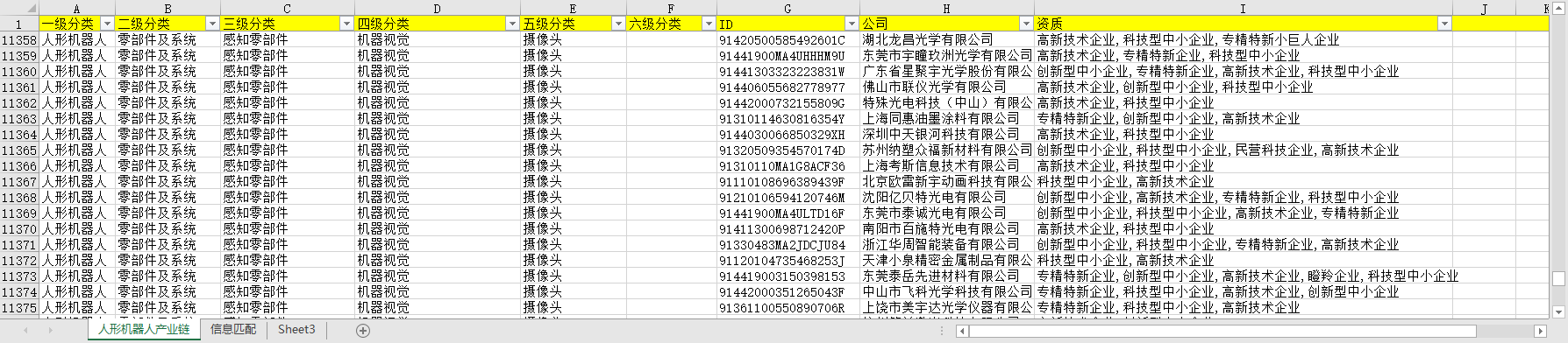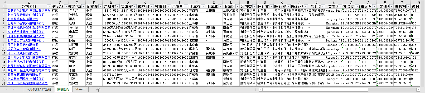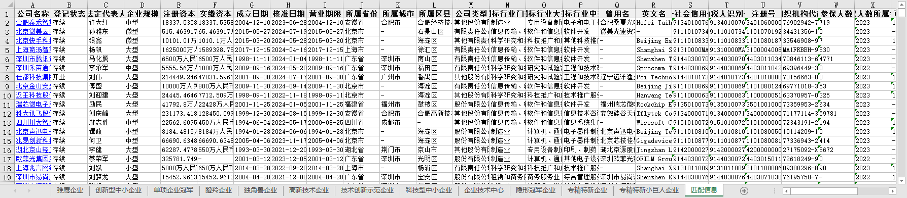 另外还有一个高新技术企业、科技型中小企业、创新型中小企业、独角兽瞪羚雏鹰隐形冠军专精特新小巨人等荣誉、企业资质的匹配信息excel数据文件