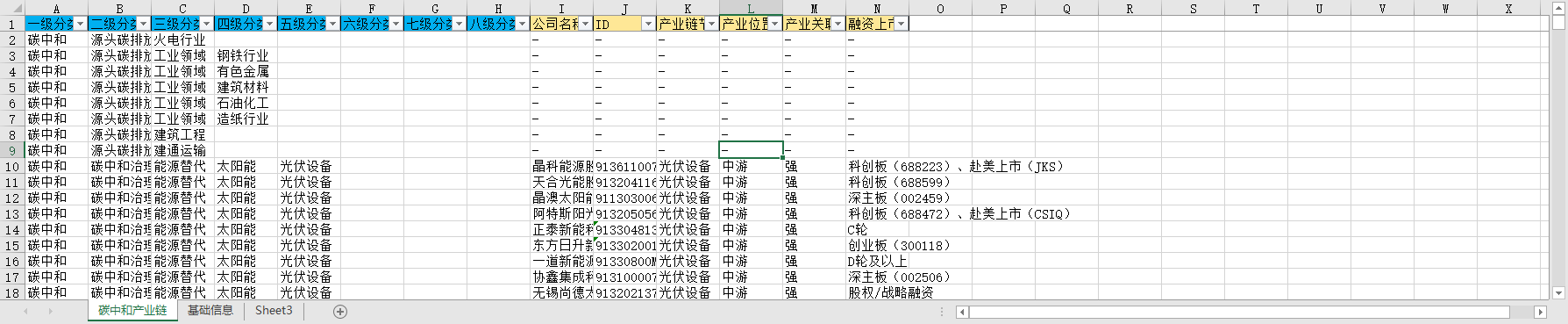 一级分类 二级分类 三级分类 四级分类 五级分类 六级分类 七级分类 八级分类 公司名称 ID 产业链节点 产业位置 产业关联性 融资上市