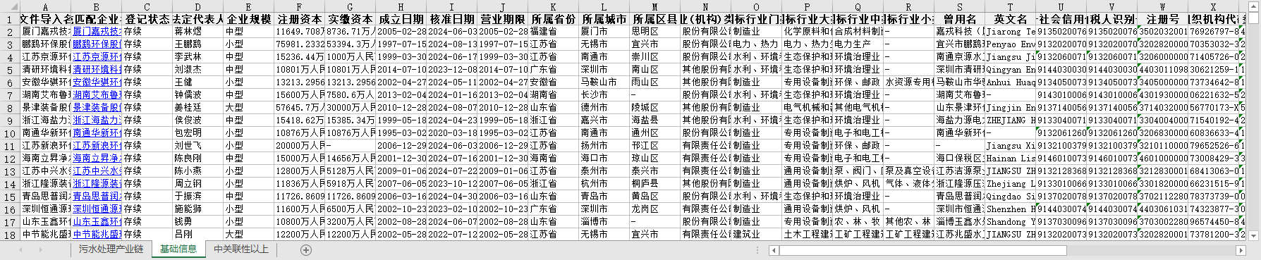 污水处理产业链全国上中下游企业信息1958-2024节点关联性参保人数联系电话法定代表人所属行业省份城市区县等