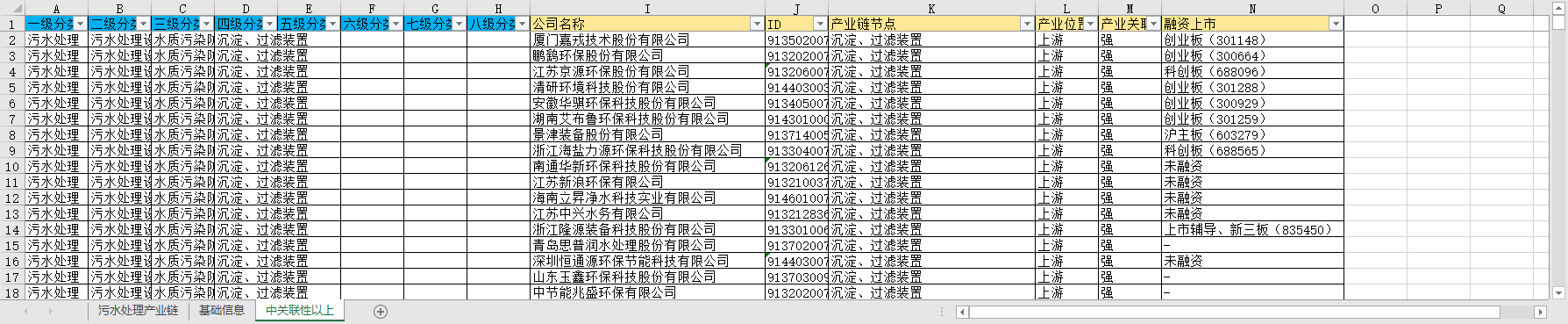 一级分类 二级分类 三级分类 四级分类 五级分类 六级分类 七级分类 八级分类 公司名称 ID 产业链节点 产业位置 产业关联性 融资上市