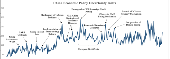 中国经济政策不确定性指数,用于衡量我国经济政策的不确定性。参考Bloom, Baker和Davis(2016)的研究,利用Wisers信息门户,获取报纸并搜索关键词构建指数。包括总指数、财政政策、货币政策、贸易政策、汇率不确定指数