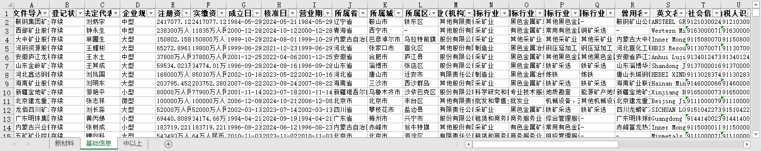 原文件导入名称 登记状态 法定代表人 企业规模 注册资本 实缴资本 成立日期 核准日期 营业期限 所属省份 所属城市 所属区县 企业(机构)类型 国标行业门类 国标行业大类 国标行业中类 国标行业小类 曾用名 英文名 统一社会信用代码 纳税人识别号 注册号 组织机构代码 参保人数 参保人数所属年报 电话 更多电话 企业地址 通信地址 官网 邮箱 更多邮箱 经营范围 登记机关 纳税人资质 企业简介 最新年报年份 等等