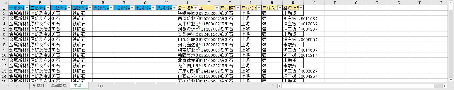 一级分类 二级分类 三级分类 四级分类 五级分类 六级分类 七级分类 八级分类 公司名称 ID 产业链节点 产业位置 产业关联性 融资上市