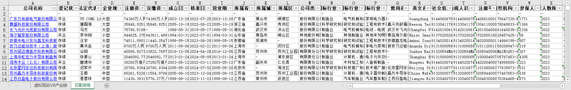 虚拟现实VR产业链全国上中下游企业信息1957-2024节点关联性参保人数联系电话法定代表人所属行业省份城市区县等