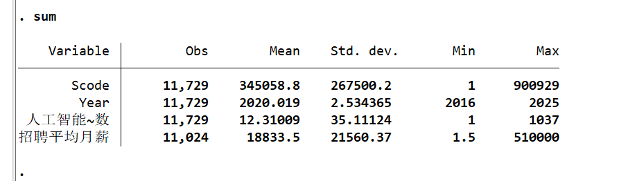 ③按照企业-年份进行招聘条数和招聘平均薪酬的累积或平均,得到企业-年份的面板数据,具体包括人工智能招聘人数和招聘平均月薪两个变量,分别代表企业当年发布的人工智能岗位招聘数量和岗位对应的平均薪酬。