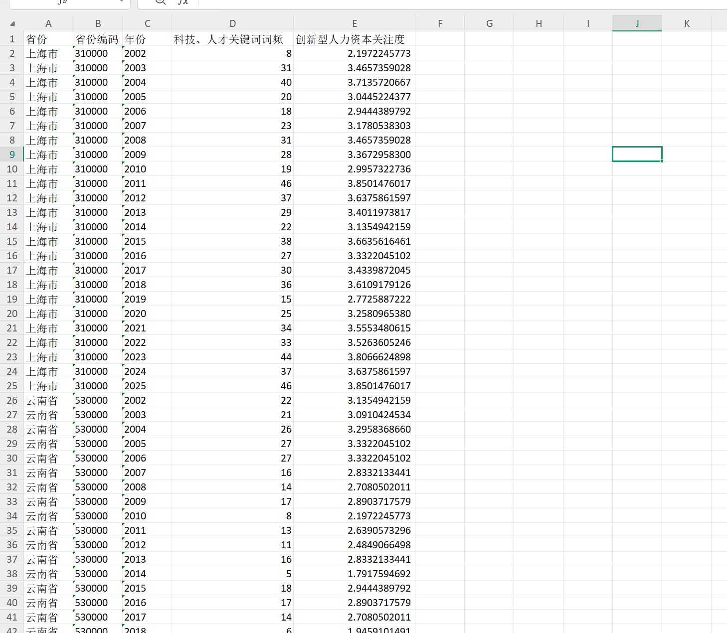指标说明:参考做法,利用历年工作报告中“科技”入才”出现的词频衡量对创新型人力资本的关注度,为保持数据平稳性对数据进行取对数处理。 词频分析关键词:“科技”“人才