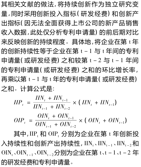 参考何郁冰(2017)的做法,计算企业持续绿色创新水平。将绿色专利申请的前后期对比来反映创新的持续程度。绿色创新持续性=企业在第t-1与t年间的绿色专利申请量之和较第t-2与t-1年间的绿色专利申请量之和的环比增长率,再乘以第t-1与t年的绿色专利申请量之和。具体计算方法如下图所示。
