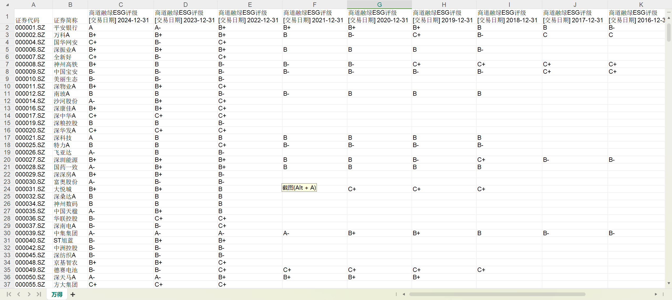 商道融绿ESG评级数据为企业提供了全面的环境、社会和治理(ESG)评级信息。这些数据涵盖了不同行业的公司,根据不同企业的表现,评级结果分为十个等级:D、C-、C、C+、B-、B、B+、A-、A、A+。每个等级对应不同的得分,最高为A+,最低为D,商道融绿的ESG评级覆盖全部中国境内上市公司,港股通中的香港上市公司,以及主要的债券发行主体,评级结果和具体ESG数据可广泛应用于投资决策、风险管理、政策制定、可持续金融产品的创新和研发。