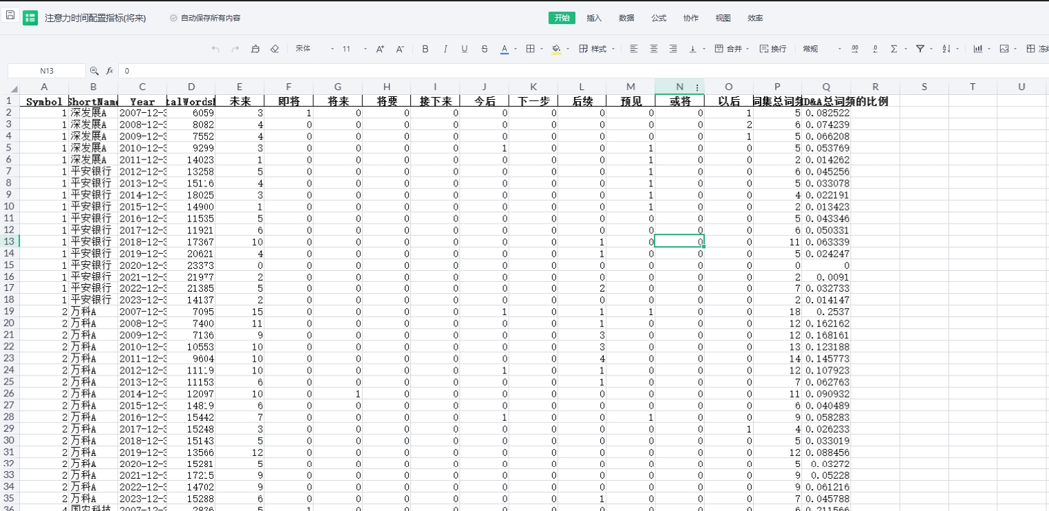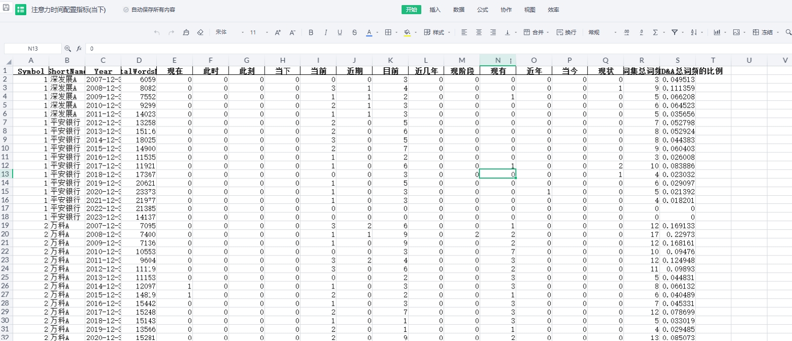 筛选出词集后,分别基于表征当下和表征未来的词集进行文本分析,并利用词典法对每家企业的年报中MD&A部分进行词频分析计算词集词频数占MD&A总词数的比例,分别得到表征当下和未来的注意力时间配置指标。