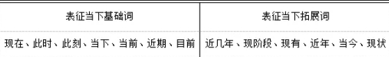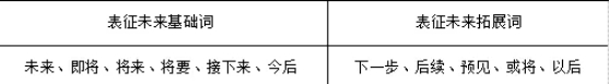第二步基于Word2vec中的 CBOW模型构造词向量空间,并在其中寻找近义词,筛选出词频数在1000词以上,和基础词相似度在30%以上。第三步邀请3名业界和学术界专家 CBOW模型得到的相似词进行人工核查,并筛选出包括“现在”“此时”等表征当下的词集,并得到包括“将来”“将要”等表征未来的词集。