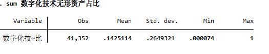 以上市公司财务报告附注披露的年末无形资产明细项中与数字化转型相关的部分占无形资产总额的比例来度量企业的数字化水 平。 具体地, 当无形资产明细项包含“ 软件” “ 网络” “ 客户端” “ 管理系统” “智能平台” 等与数字化转型技术相关的关键词时, 将该明细项目界定为 “数字化技术无形资产” 。