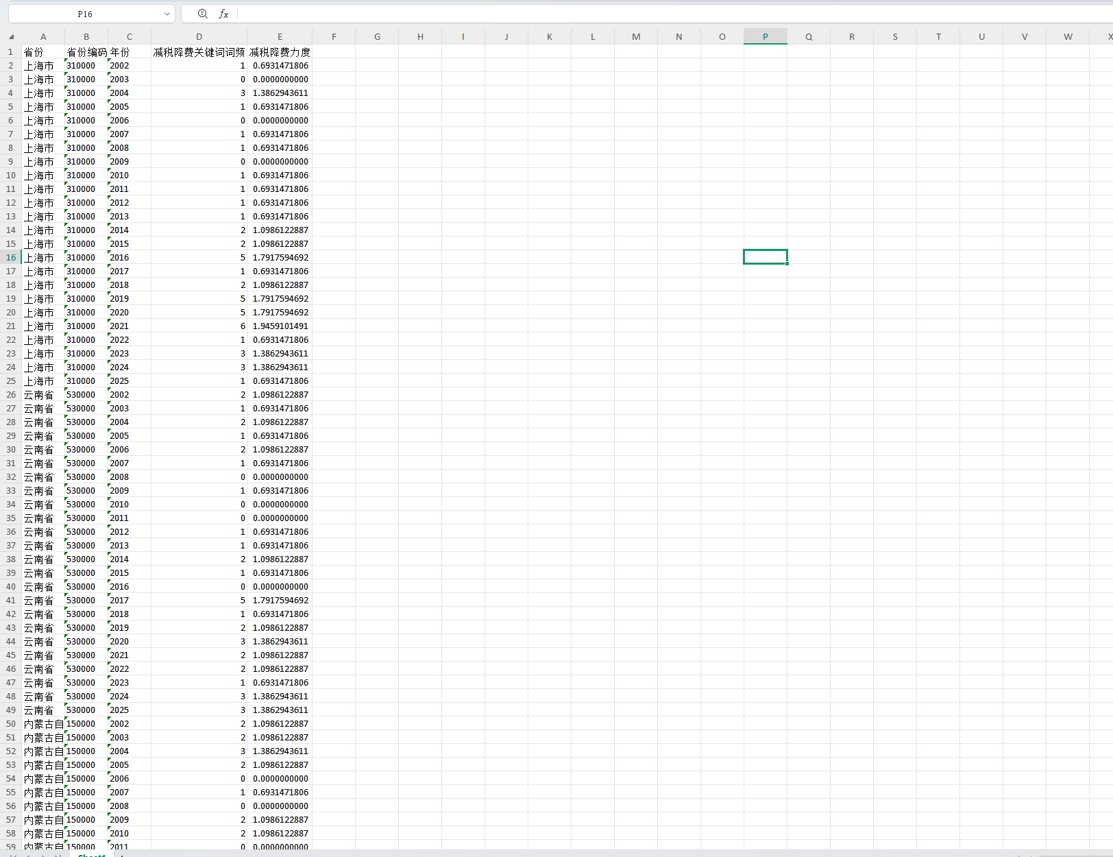 其中,与减税力度相关的词汇包括“减税”“税收返还”“退税”“税收优惠”“税率降低”“减征“减免”;与降费力度相关的词汇包括"降费"等;与减税和降费为度伺时相关的词汇主要是“税费减免”。该指标不仅全面同时度量了减税和降费力度,还因为报告多在年初制定,不受当年经济发展状况的反向影响,具有很好的外生性。