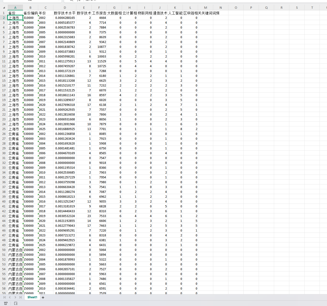 参考用数字技术关键词词频占报告总词频的比重代表各省份数字技术水平。在数字技术关键词的确定上,借鉴相关研究,确定数字技术主要包括大数据、云计算、区块链、人工智能、通信技术和物联网6个方面,并最终筛选出关键词58个。所有数字技术关键词如下所示。