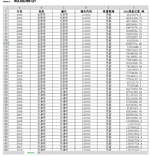 年份、省份、城市、城市代码、区县、二氧化碳排放总量