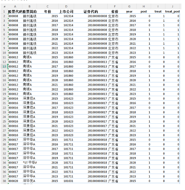 [color=rgba(0, 0, 0, 0.9)]数据库选取了沪深两市2013—2023年制造业上市公司为初始样本,并对初始样本进行以下处理:(1)剔除样本期内被ST、ST*、PT 的企业;(2)剔除资不抵债样本;(3)剔除主要变量缺失样本。 处理组Treat:企业属于贵州、海南、广西、山西、北京、河北、河南、重庆、江苏、山东,湖南和四川12个省份为1,其他行业为0。Post:2018年及之后为1,2018年前为0。Treat_Post:处理组Treat与Post同时为1时为1,其他为0。