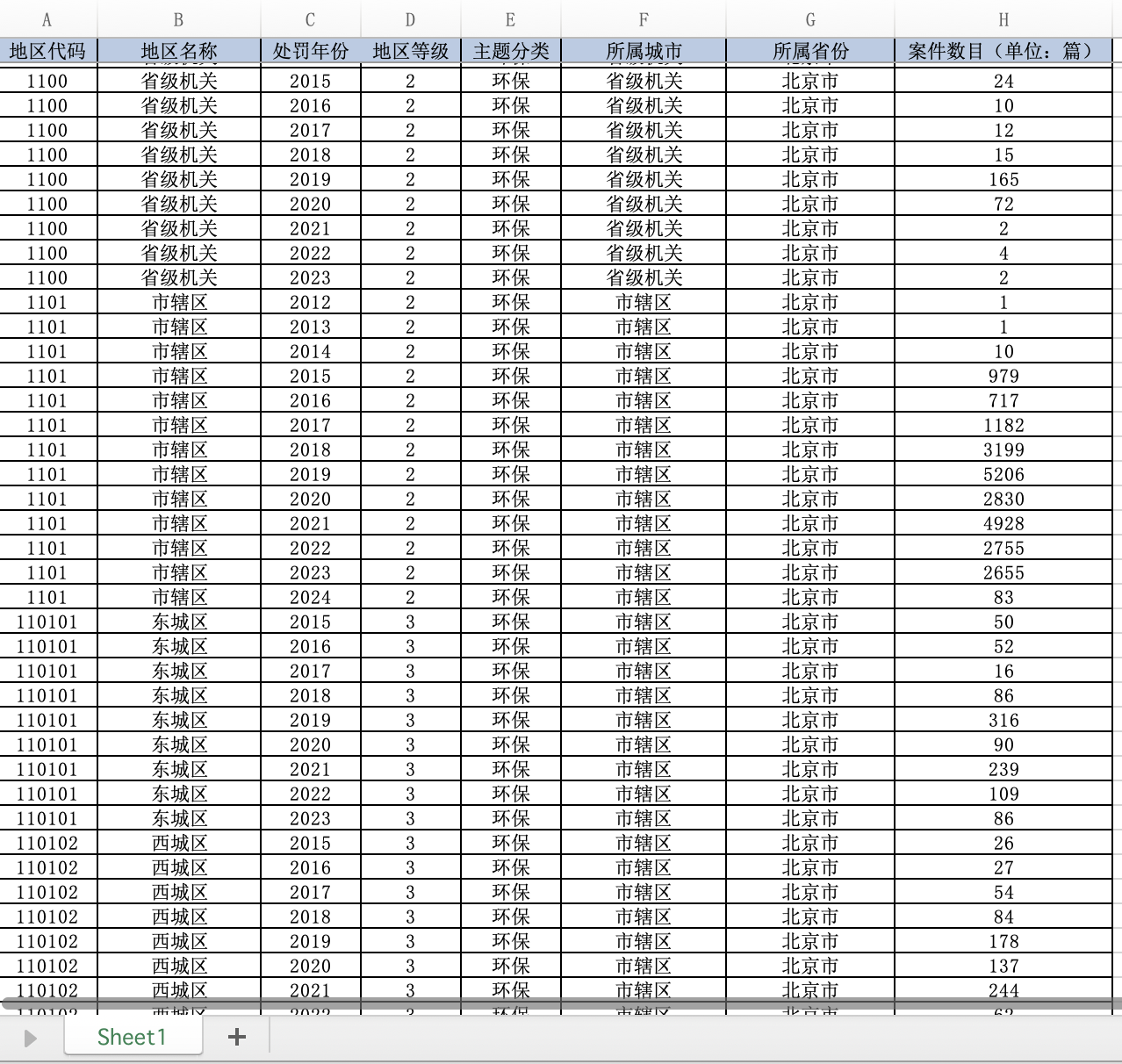 全国省市县环保处罚案件数据(2008-2024年)Excel面板数据统计