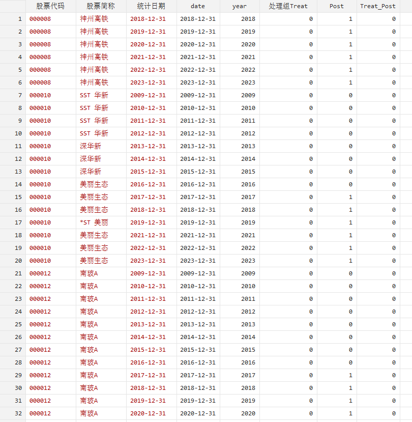 2016年6月,国务院发布《关于在市场竞争体系中建立公平竞争审查制度的意见》,力争从源头上肃清行政垄断行为,构建公平竞争的市场环境。该项制度将规制对象锁定在排除和限制竞争的各类政策措施上,从市场准入和退出标准、商品和要素自由流动、影响生产经营成本标准、影响生产经营行为标准四方面为推动制度落实提供指引,并利用“清理存量+规范增量”叠加的方式严格预防和控制行政性垄断,审查成果收效甚好。 数据库选取了沪深两市2011—2024年工业上市公司为初始样本,并对初始样本进行以下处理:(1)剔除资不抵债样本;(2)剔除主要变量缺失样本;(3)对所有连续型变量 进行上下1%的缩尾处理。 处理组Treat:企业属于行政垄断行业为1,其他行业为0。 数据库所指行政垄断行业包括:黑色金属矿采选业,石油和天然气开采业,有色金属矿采选业,煤炭开采和洗选业,开采辅助活动,黑色金属冶炼和压延加工业,有色金属冶炼和压延加工业,石油加工、炼焦和核燃料加工业,铁路、船舶、航空航天和其他运输设备制造业,水的生产和供应业,电力、热力生产和供应业,燃气生产和供应业,水上运输业,铁路运输业,航空运输业,道路运输业,电信、广播电视和卫星传输服务,公共设施管理业。 Post:2017年及之后为1,2017年前为0。因为公平竞争审查制度的实施时间是2016年,但各地实际落实的时间集中在2016年底至2017年。 Treat_Post:处理组Treat与Post同时为1时为1,其他为0。