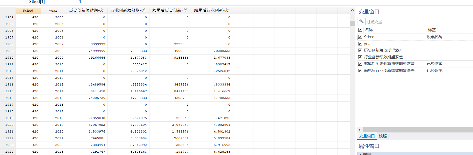 3.资料范围:4.9万个样本,4775家企业,具体指标为 Stkcd year 历史创新绩效期望落差 行业创新绩效期望落差(社会期望法测量) 缩尾后历史创新绩效期望落差 缩尾后行业创新绩效期望落差