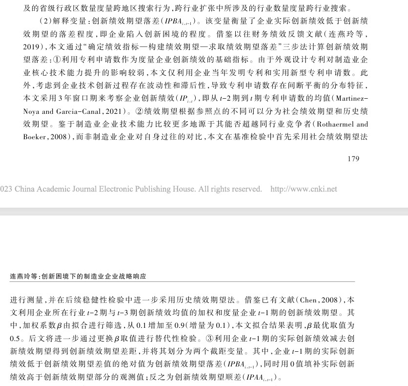 连燕玲,郑伟伟,高皓.创新困境下的制造业企业战略响应——基于创新绩效期望落差与响应式搜索行为的研究[J].中国工业经济,2023,(08):174-192.DOI:10.19581/j.cnki.ciejournal.2023.08.010.