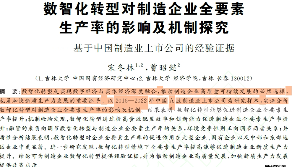 [1]宋冬林,曾昭懿.数智化转型对制造企业全要素生产率的影响及机制探究——基于中国制造业上市公司的经验证据[J/OL].科技进步与对策,1-12[2025-04-02]