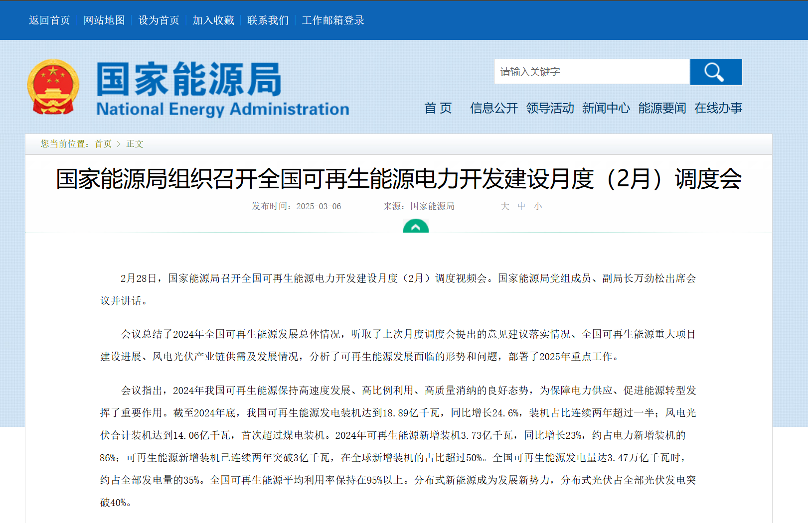 2月28日,国家能源局召开全国可再生能源电力开发建设月度(2月)调度视频会。会议指出,2025年是“十四五”收官之年,也是谋划“十五五”的关键之年,可再生能源发展规划面临更多机遇、更大空间、更高要求和更多挑战。要高质量做好新能源消纳工作,要积极应对、多方施策,确保全国风电光伏发电消纳利用率保持在合理水平。