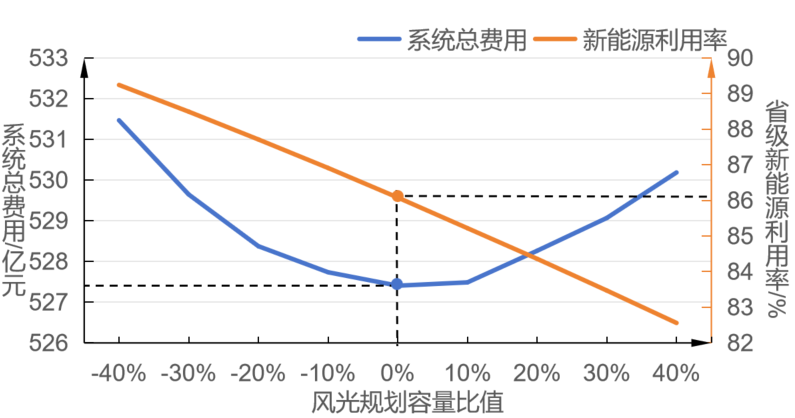 随着风光规划容量的增多,该省新能源消纳率从89.24%降至82.56%,同时系统总运行成本呈现先下降后上升的趋势,系统规划理论合理消纳率86.1%。