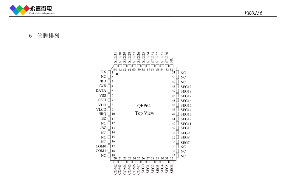 VK0256B 2.4V~5.2V 32seg*8com 偏置电压1/4 LQFP-64