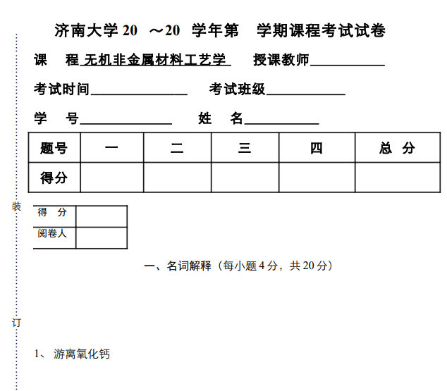济大济南大学无机非金属材料工艺学期末试卷及答案