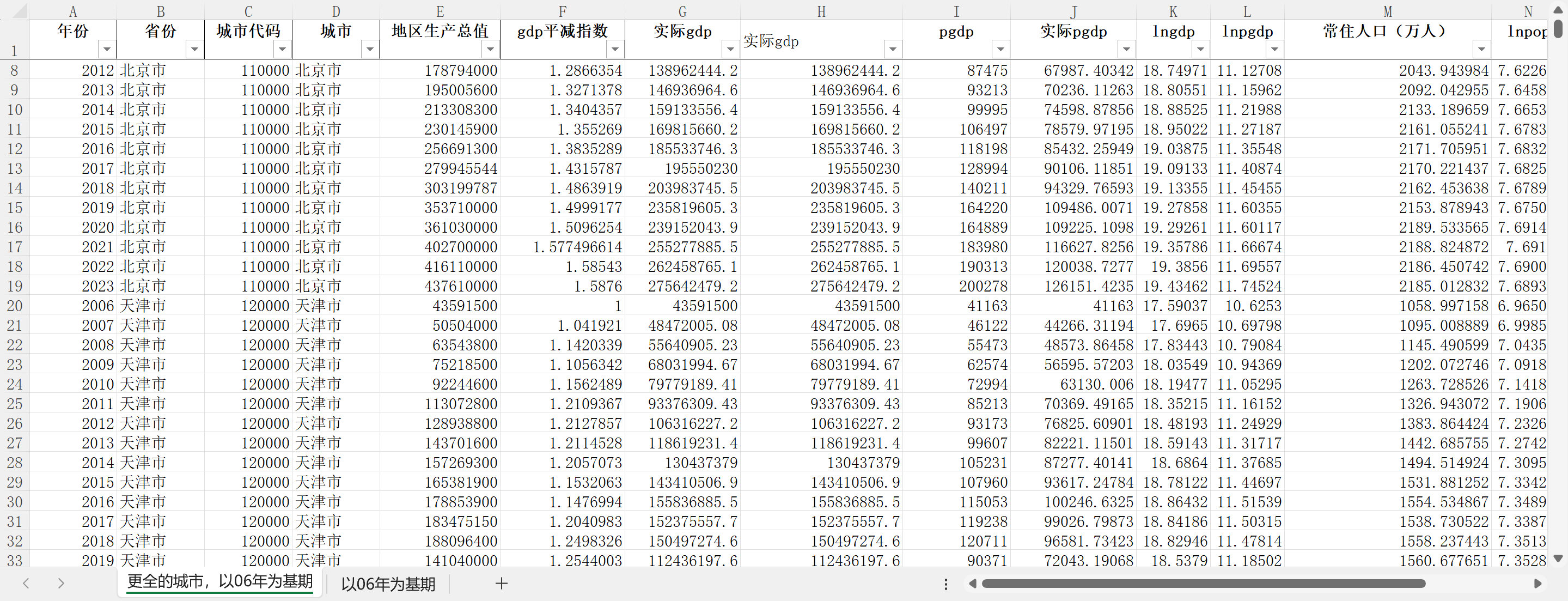 目前网上还没有更新到2023年的地级市GDP,人均GDP平减版本。通过中国城市统计年鉴获取2006-2023年城市GDP数据,并根据各省份价格指数(以2006年为基期)计算了地级市实际GDP和人均GDP数据。已经整理成面板数据,可直接使用。