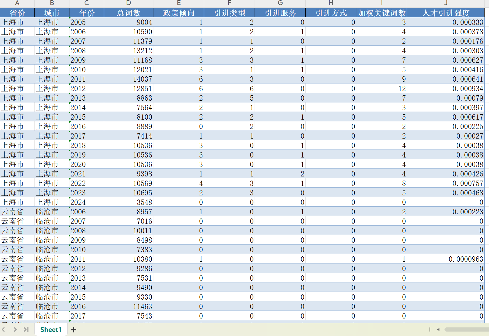 政府工作报告中涉及的人才引进政策,不仅反映了各地政府的战略倾向,还影响了未来一年的具体政策和经济发展方向。对全国300个城市在2005-2024年间的政府工作报告进行整理,对政策倾向、引进类型、引进服务、引进方式等关键词的频次进行统计,旨在为研究者衡量地方政府人才引进政策的实施强度提供数据支持