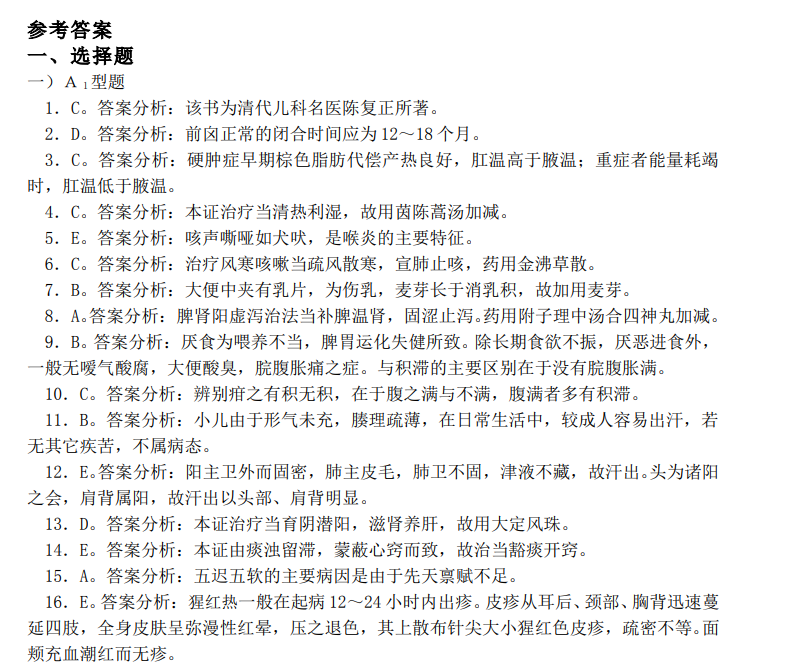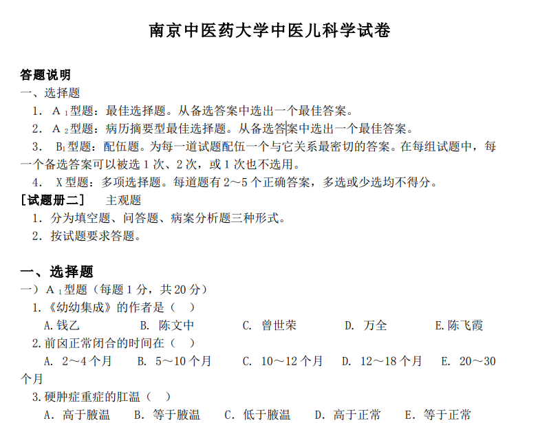 南中医南京中医药大学中医儿科学期末试卷及答案一套(即一年的)
