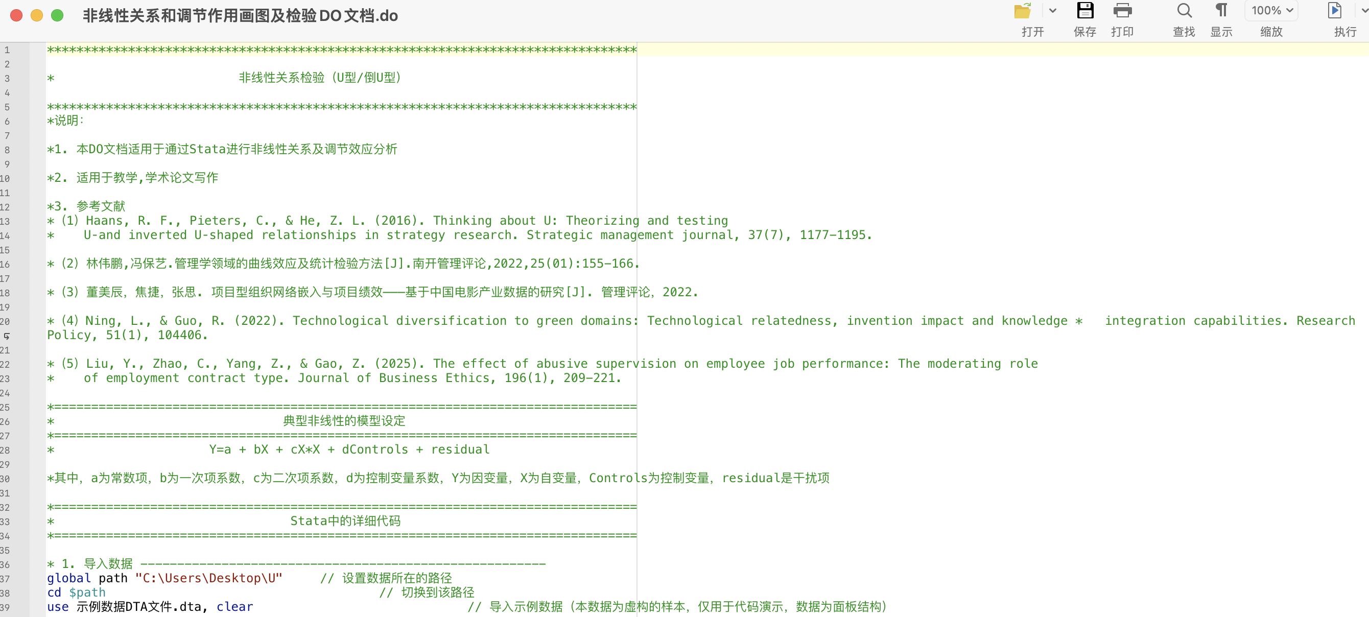 1. 本附件适用于通过Stata验证解释变量和被解释变量间的非线性关系及调节效应