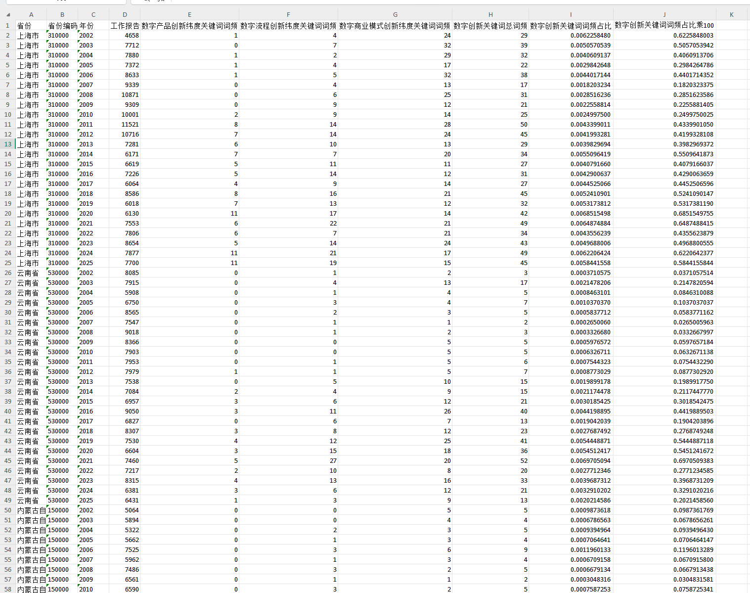 处理说明:原始数据为使用Python对地方政府工作报告进行文本分析后获得(jieba分词,停用词表使用哈工大停用词表),后续使用Stata进行整理,最终形成面板数据形式