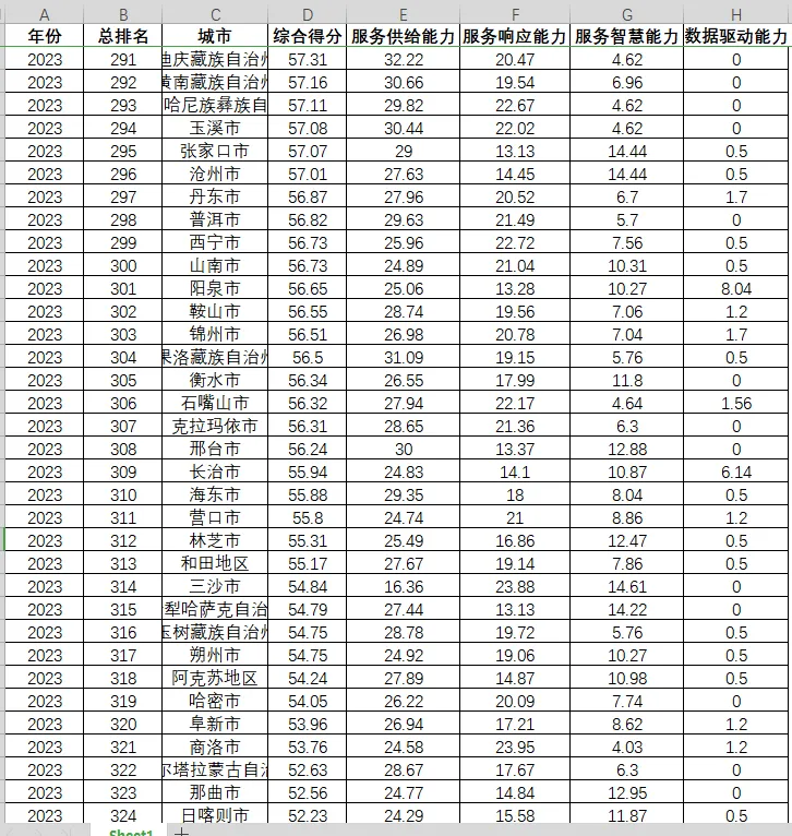 在政府电子服务能力数据中,不论是省级层面还是地级市层面,自2021年起,才包含直辖市;另外,该数据中的指标“数据驱动能力”是在2023年才设置的,在此之前均未有。